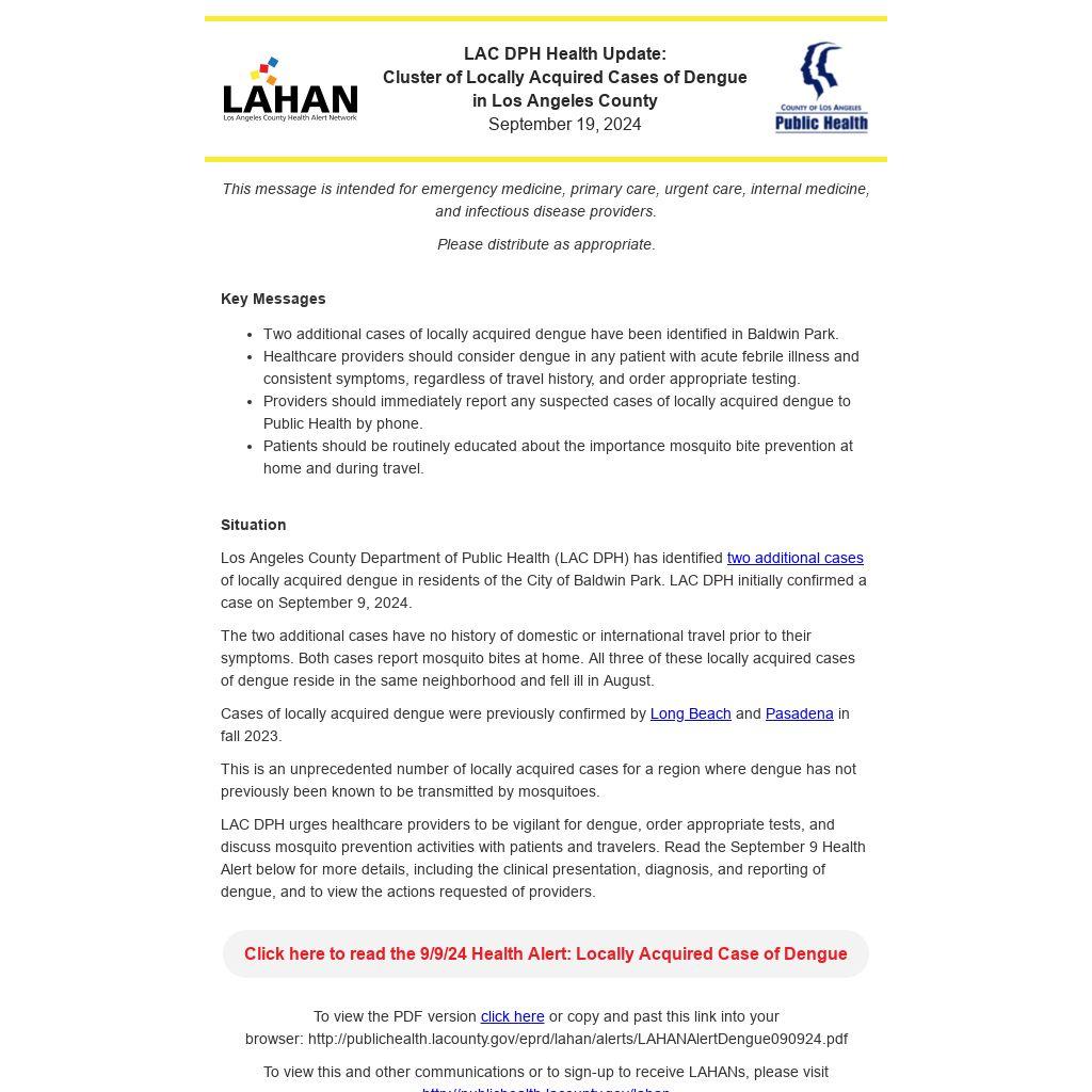 LAC DPH urges healthcare providers to be vigilant for dengue, order appropriate tests, and discuss mosquito prevention activities with patients and travelers. Read the September 9 Health Alert below for more details, including the clinical presentation, diagnosis, and reporting of dengue, and to view the actions requested of providers.