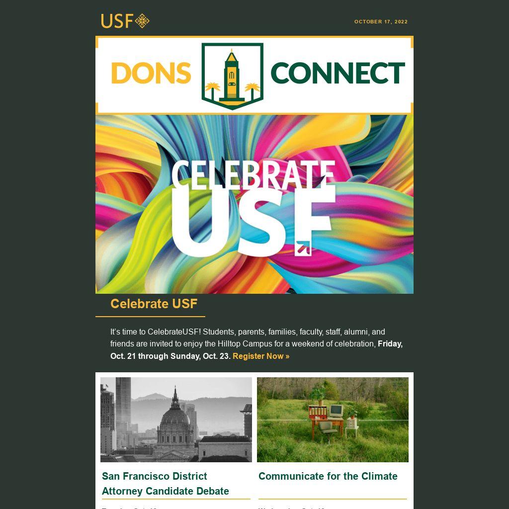 It’s time to CelebrateUSF! Students, parents, families, faculty, staff, alumni, and friends are invited to enjoy the Hilltop Campus for a weekend of celebration, Friday, Oct. 21 through Sunday, Oct. 23.Register Now »