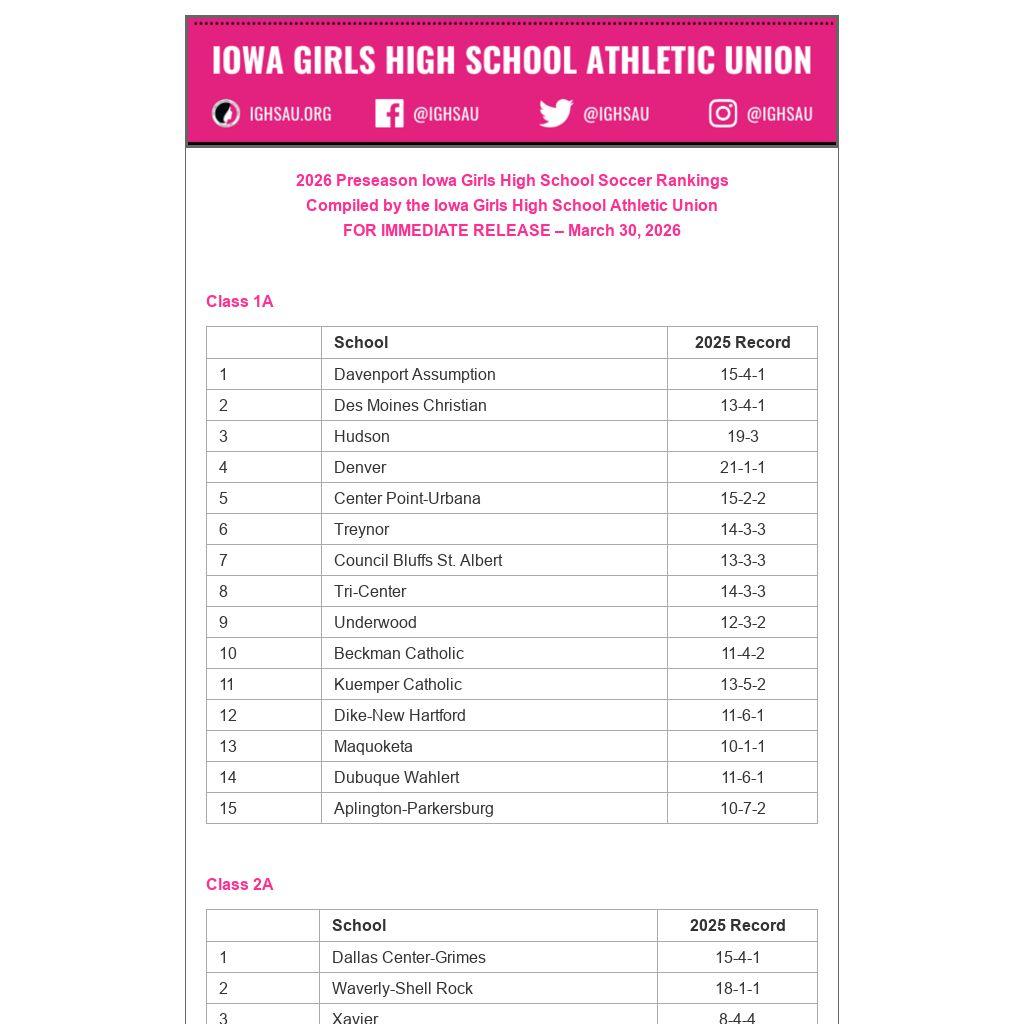 2026 Preseason Iowa Girls High School Soccer Rankings