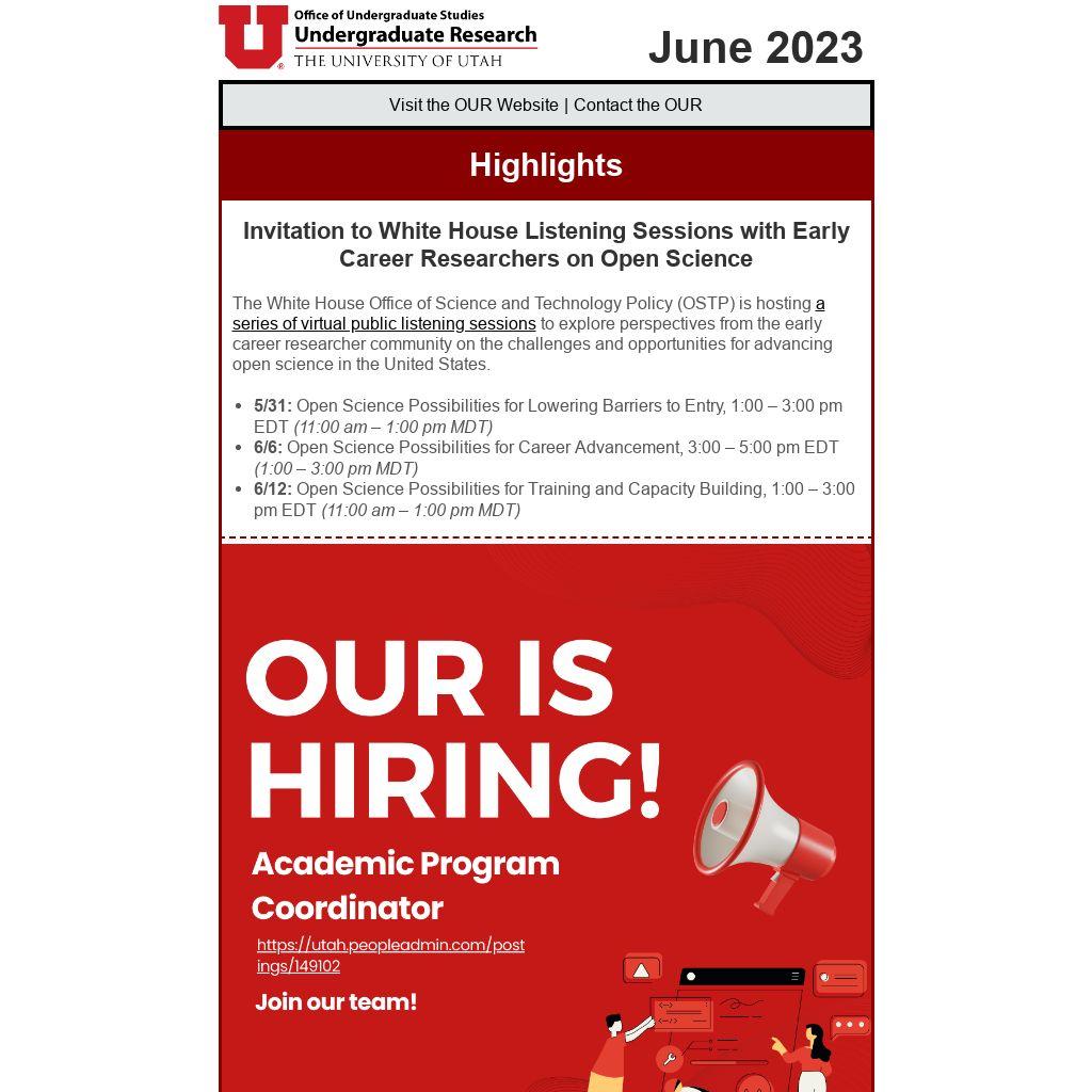 The OUR is excited to announce a new scholarship program! Early Exploration Scholars receive a $500 scholarship. Eligible applicants: undergraduate students within their first 60 credits at the University of Utah. Underrepresented students in their fields of interest and Pell grant eligible students (low-income) are highly encouraged to apply. Fall 2023 Deadline: August 15.