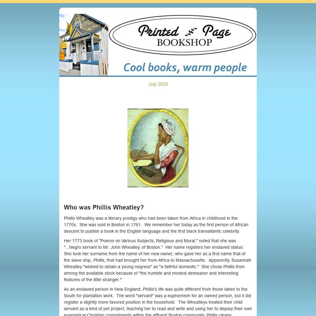 Phillis Wheatley was a literary prodigy who had been taken from Africa in childhood in the 1770s. She was sold in Boston in 1761. We remember her today as the first person of African descent to publish a book in the English language and the first black transatlantic celebrity.