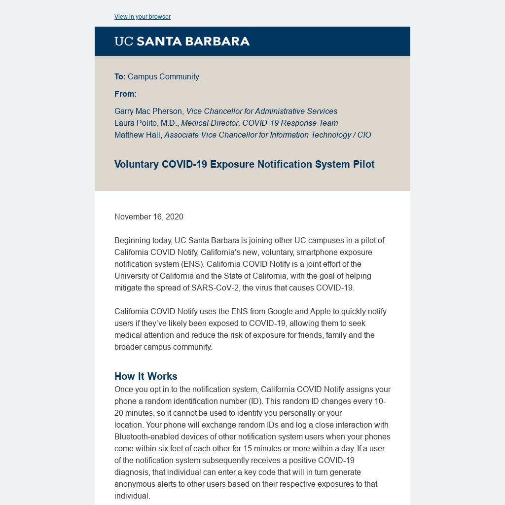 Beginning today, UC Santa Barbara is joining other UC campuses in a pilot of California COVID Notify, California’s new, voluntary, smartphone exposure notification system (ENS). California COVID Notify is a joint effort of the University of California and the State of California, with the goal of helping mitigate the spread of SARS-CoV-2, the virus that causes COVID-19.
