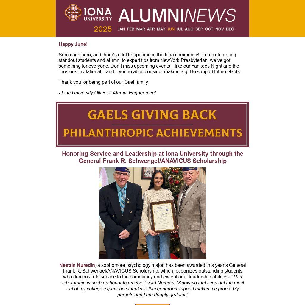 Summer’s here, and there’s a lot happening in the Iona community! From celebrating standout students and alumni to expert tips from NewYork-Presbyterian, we’ve got something for everyone. Don’t miss upcoming events—like our Yankees Night and the Trustees Invitational—and if you’re able, consider making a gift to support future Gaels.