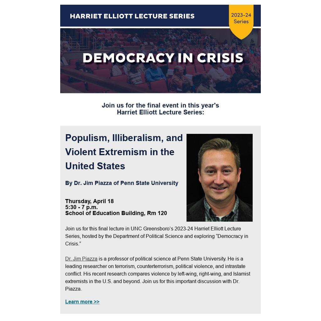 Join us for this final lecture in UNC Greensboro’s 2023-24 Harriet Elliott Lecture Series, hosted by the Department of Political Science and exploring “Democracy in Crisis.”