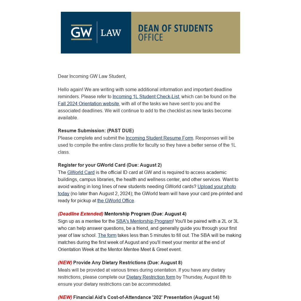 Hello again! We are writing with some additional information and important deadline reminders. Please refer to Incoming 1L Student Check-List, which can be found on the Fall 2024 Orientation website, with all of the tasks we have sent to you and the associated deadlines. We will continue to add to the checklist as new tasks become available.
