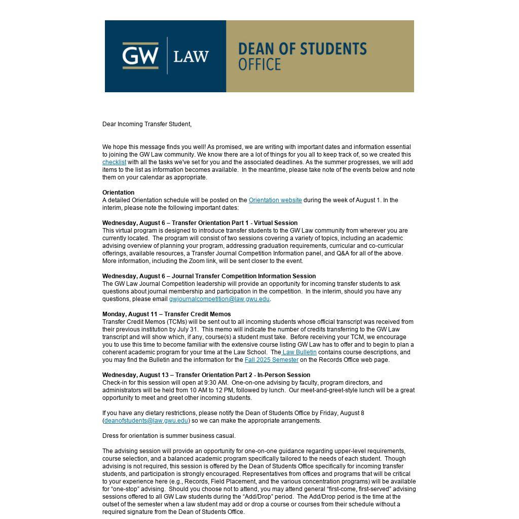 We hope this message finds you well! As promised, we are writing with important dates and information essential to joining the GW Law community. We know there are a lot of things for you all to keep track of, so we created this checklist with all the tasks we've set for you and the associated deadlines. As the summer progresses, we will add items to the list as information becomes available. In the meantime, please take note of the events below and note them on your calendar as appropriate.