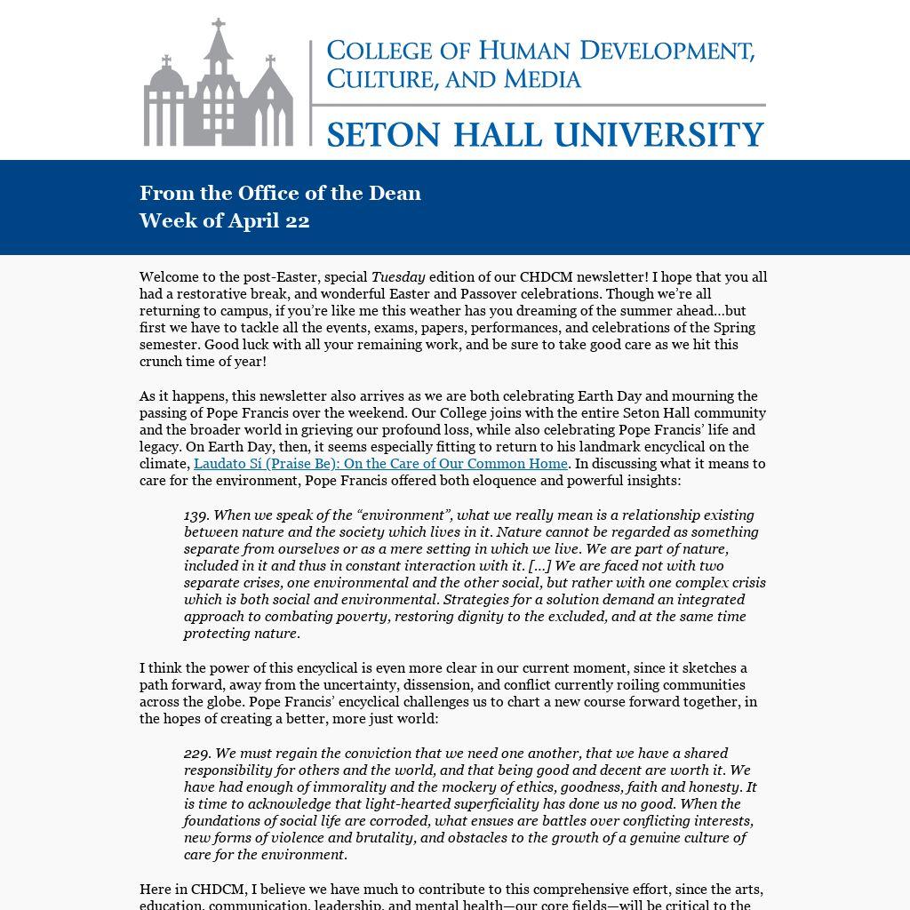 As it happens, this newsletter also arrives as we are both celebrating Earth Day and mourning the passing of Pope Francis over the weekend. Our College joins with the entire Seton Hall community and the broader world in grieving our profound loss, while also celebrating Pope Francis’ life and legacy. On Earth Day, then, it seems especially fitting to return to his landmark encyclical on the climate, Laudato Sí (Praise Be): On the Care of Our Common Home. In discussing what it means to care for the environment, Pope Francis offered both eloquence and powerful insights: