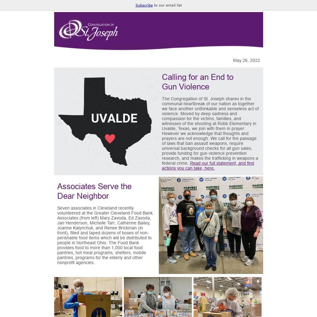 The Congregation of St. Joseph shares in the communal heartbreak of our nation as together we face another unthinkable and senseless act of violence. Moved by deep sadness and compassion for the victims, families, and witnesses of the shooting at Robb Elementary in Uvalde, Texas, we join with them in prayer. However we acknowledge that thoughts and prayers are not enough. We call for the passage of laws that ban assault weapons, require universal background checks for all gun sales, provide funding for gun violence prevention research, and makes the trafficking in weapons a federal crime. Read our full statement, and find actions you can take, here.
