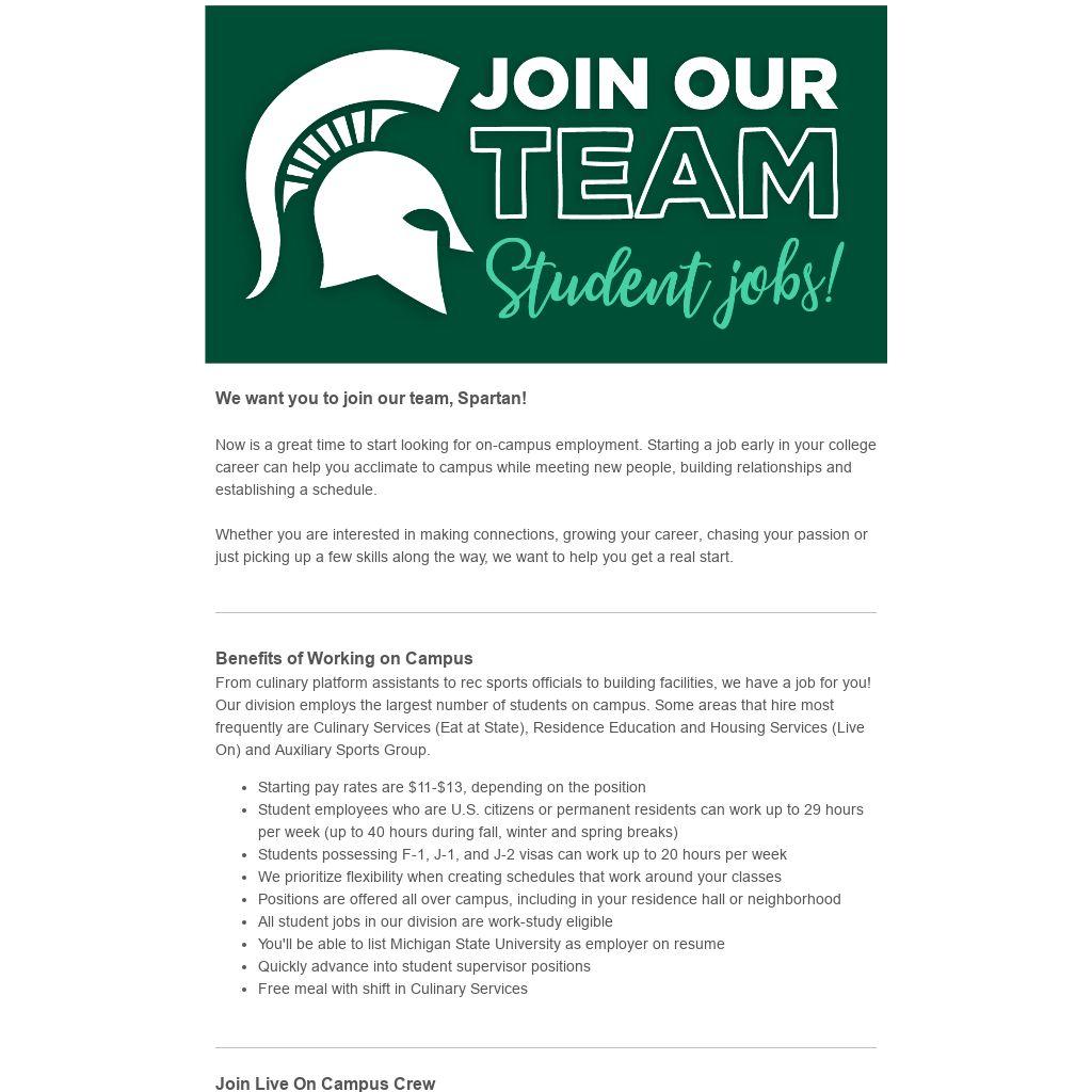 Join the Live On Campus Crew and become a brand ambassador for Live On! As a member of this diverse group of undergraduate students, you'll have the opportunity to plan events, create social media and digital content, and promote connection, engagement, inclusion, and Spartan spirit within on-campus living. This role not only allows you to grow and learn as a student leader but also offers the chance to build meaningful relationships across campus. Apply now and be a part of shaping the Live On campus experience!