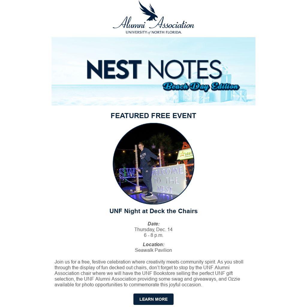 Join us for a free, festive celebration where creativity meets community spirit. As you stroll through the display of fun decked out chairs, don’t forget to stop by the UNF Alumni Association chair where we will have the UNF Bookstore selling the perfect UNF gift selection, the UNF Alumni Association providing some swag and giveaways, and Ozzie available for photo opportunities to commemorate this joyful occasion.