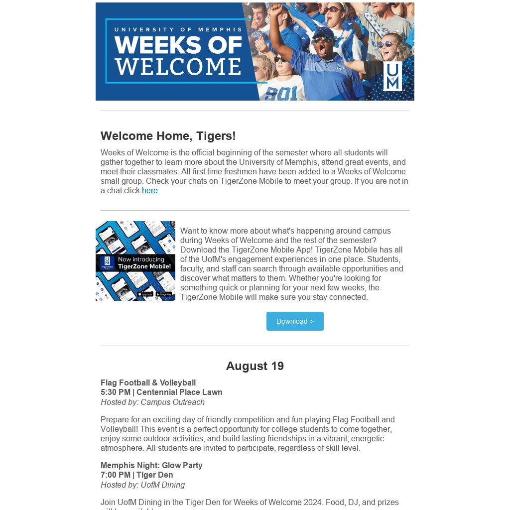 Weeks of Welcome is the official beginning of the semester where all students will gather together to learn more about the University of Memphis, attend great events, and meet their classmates. All first time freshmen have been added to a Weeks of Welcome small group. Check your chats on TigerZone Mobile to meet your group. If you are not in a chat click here.