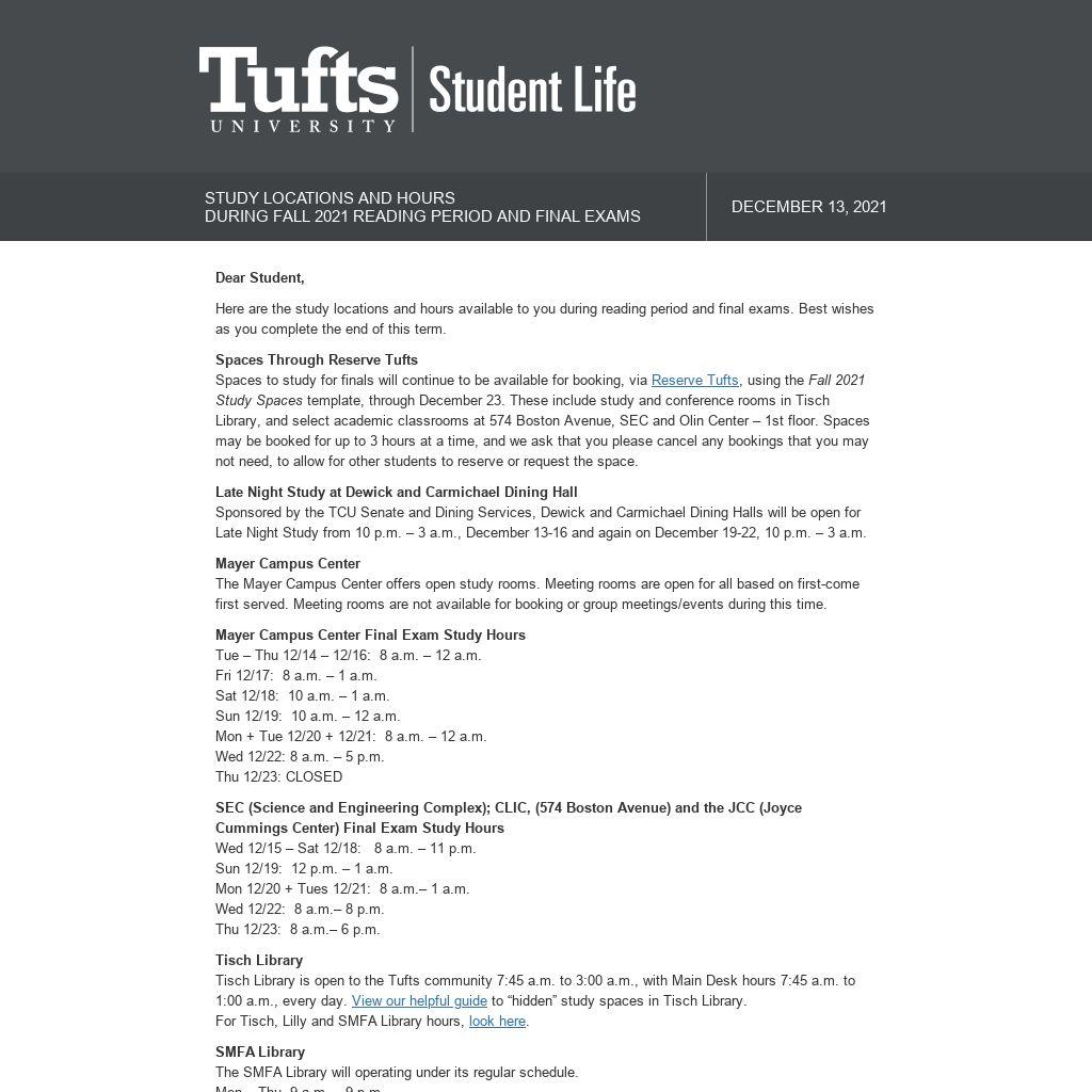 Spaces to study for finals will continue to be available for booking, via Reserve Tufts, using the Fall 2021 Study Spaces template, through December 23. These include study and conference rooms in Tisch Library, and select academic classrooms at 574 Boston Avenue, SEC and Olin Center – 1st floor. Spaces may be booked for up to 3 hours at a time, and we ask that you please cancel any bookings that you may not need, to allow for other students to reserve or request the space.