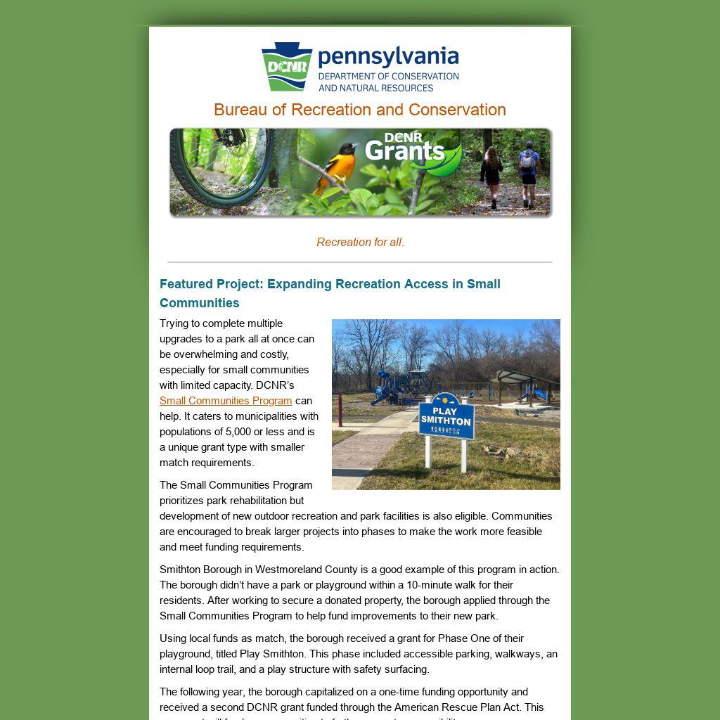 The maximum grant request recently increased to allow the Small Communities Program to support even larger projects. Applicants can now request up to $100,000 in funding from DCNR, with a match requirement of $70,000. Both cash and non-cash match are accepted.