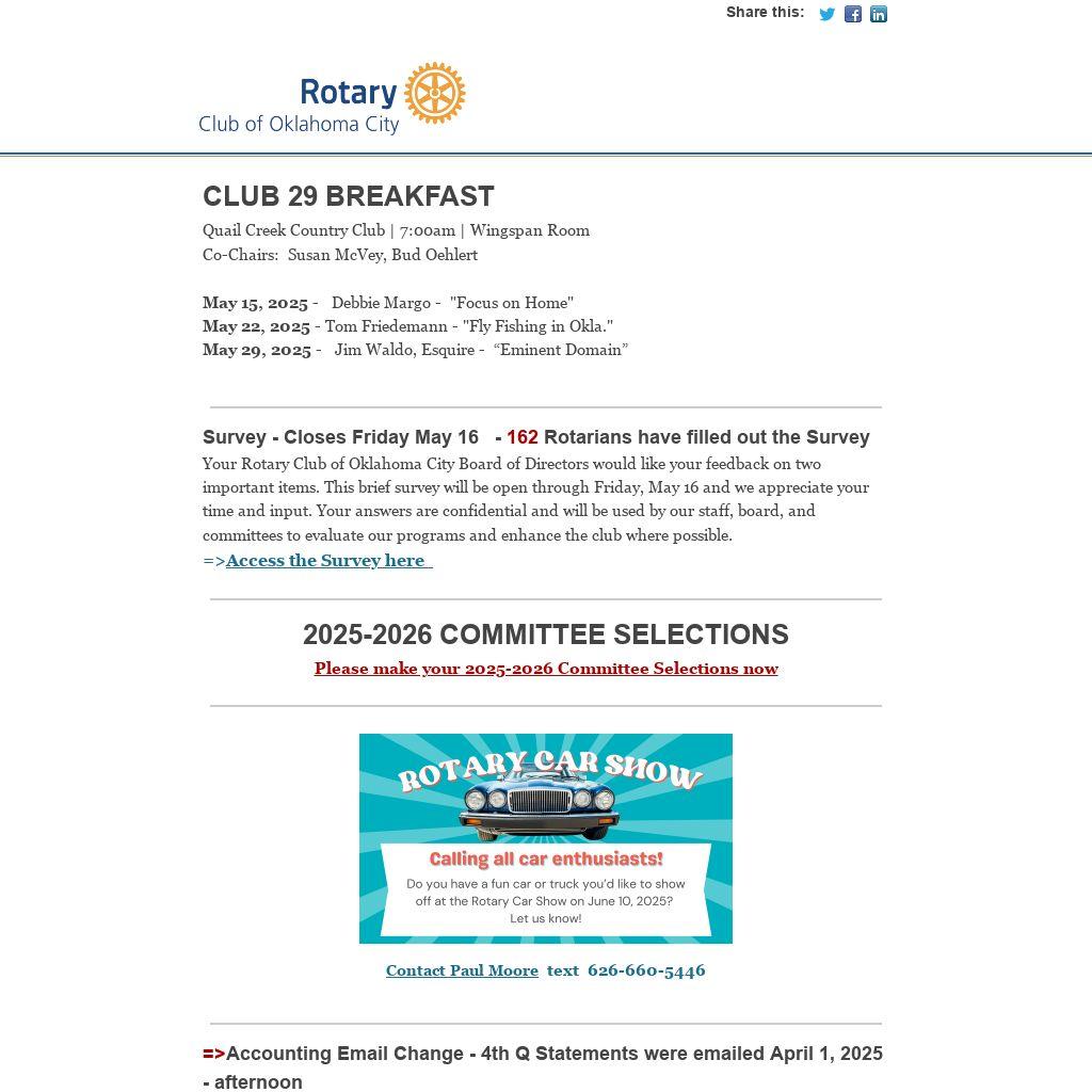Your Rotary Club of Oklahoma City Board of Directors would like your feedback on two important items. This brief survey will be open through Friday, May 16 and we appreciate your time and input. Your answers are confidential and will be used by our staff, board, and committees to evaluate our programs and enhance the club where possible.