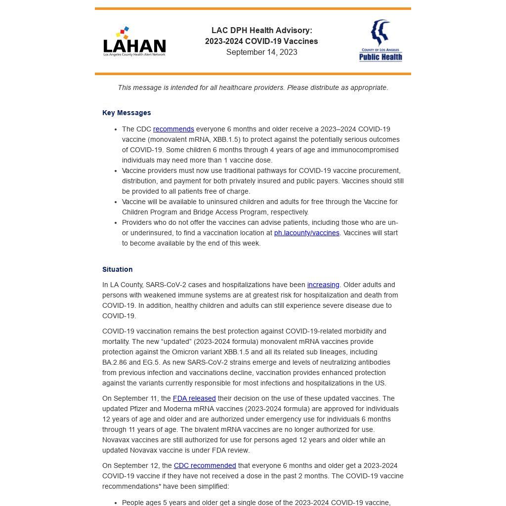 COVID-19 vaccination remains the best protection against COVID-19-related morbidity and mortality. The new “updated” (2023-2024 formula) monovalent mRNA vaccines provide protection against the Omicron variant XBB.1.5 and all its related sub lineages, including BA.2.86 and EG.5. As new SARS-CoV-2 strains emerge and levels of neutralizing antibodies from previous infection and vaccinations decline, vaccination provides enhanced protection against the variants currently responsible for most infections and hospitalizations in the US.
