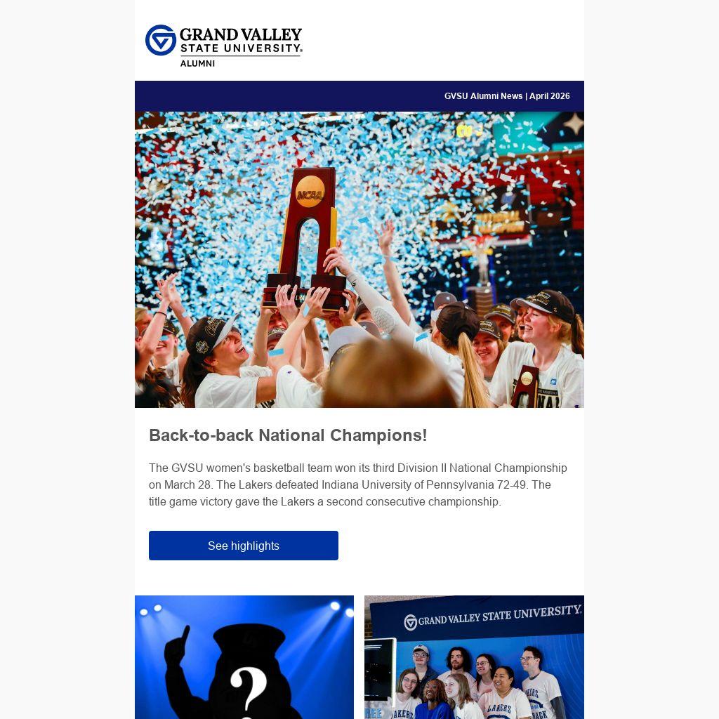 The GVSU women's basketball team won its third Division II National Championship on March 28. The Lakers defeated Indiana University of Pennsylvania 72-49. The title game victory gave the Lakers a second consecutive championship.