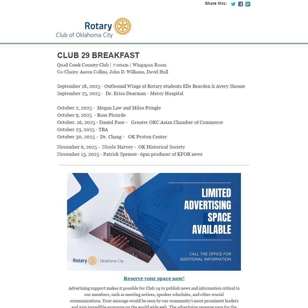 Advertising support makes it possible for Club 29 to publish news and information critical to our members, such as meeting notices, speaker schedules, and other crucial communications. Your message would be seen by our community's most prominent leaders and gain incredible exposure on the world wide web. The advertising revenue pays for the software we use to design and distribute the newsletters as well as Club 29's website hosting, so your support is important to all members.