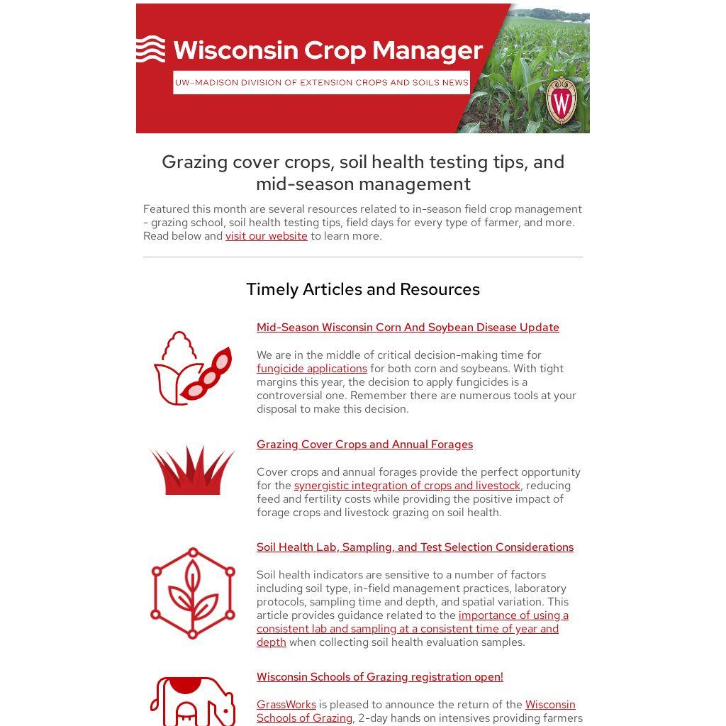 Featured this month are several resources related to in-season field crop management - grazing school, soil health testing tips, field days for every type of farmer, and more. Read below and visit our website to learn more.