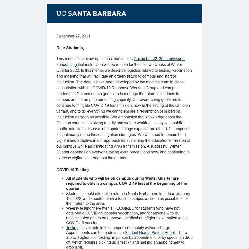 This memo is a follow-up to the Chancellor’s December 22, 2021 message announcing that instruction will be remote for the first two weeks of Winter Quarter 2022. In this memo, we describe logistics related to testing, vaccination and masking that will facilitate an orderly return to campus and start of instruction. The details have been developed by the medical team in close consultation with the COVID-19 Response Working Group and campus leadership. Our immediate goals are to manage the return of students to campus and to ramp up our testing capacity. Our overarching goals are to continue to mitigate COVID-19 transmission, now in the setting of the Omicron variant, and to do everything we can to ensure a resumption of in-person instruction as soon as possible. We emphasize that knowledge about the Omicron variant is evolving rapidly and we are working closely with public health, infectious disease, and epidemiology experts from other UC campuses to continually refine these mitigation strategies. We will need to remain both vigilant and adaptive in our approach for sustaining the educational mission of our campus while also mitigating virus transmission. A successful Winter Quarter depends on everyone taking extra precautions now, and continuing to exercise vigilance throughout the quarter.