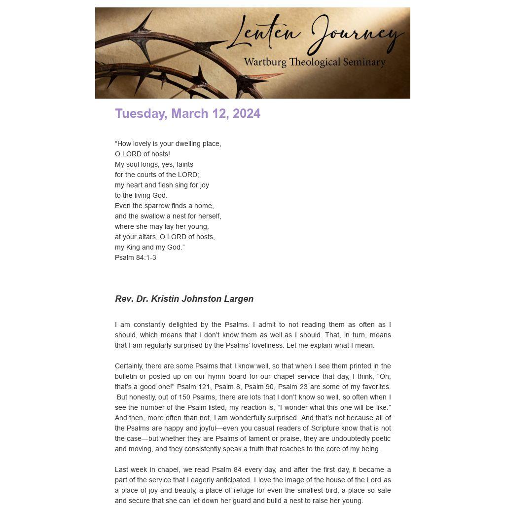 Certainly, there are some Psalms that I know well, so that when I see them printed in the bulletin or posted up on our hymn board for our chapel service that day, I think, “Oh, that’s a good one!” Psalm 121, Psalm 8, Psalm 90, Psalm 23 are some of my favorites. But honestly, out of 150 Psalms, there are lots that I don’t know so well, so often when I see the number of the Psalm listed, my reaction is, “I wonder what this one will be like.” And then, more often than not, I am wonderfully surprised. And that’s not because all of the Psalms are happy and joyful—even you casual readers of Scripture know that is not the case—but whether they are Psalms of lament or praise, they are undoubtedly poetic and moving, and they consistently speak a truth that reaches to the core of my being.