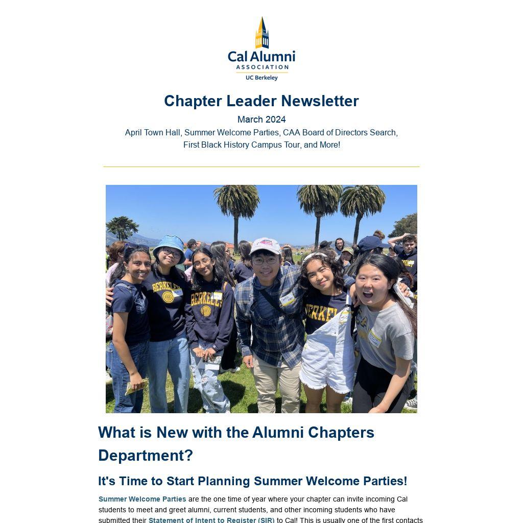Summer Welcome Parties are the one time of year where your chapter can invite incoming Cal students to meet and greet alumni, current students, and other incoming students who have submitted their Statement of Intent to Register (SIR) to Cal! This is usually one of the first contacts the students have with alumni after sending their acceptance into Cal and we want to make sure to give them a great welcoming experience as we do every year! And as always, please feel free to collaborate with other Chapters! If your chapter has not hosted a Summer Welcome Party before and is interested, please make sure to attend the April Town Hall (see below)!