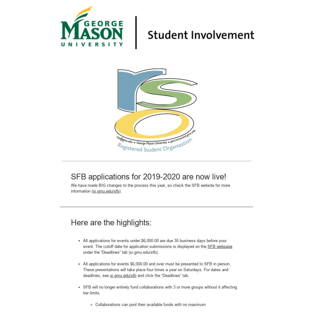 We have made BIG changes to the process this year, so check the SFB website for more information (si.gmu.edu/sfb).