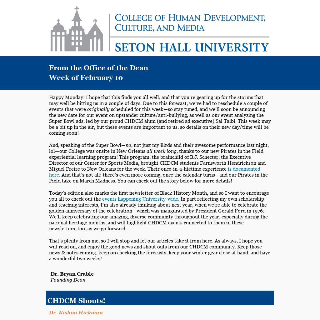 And, speaking of the Super Bowl—no, not just my Birds and their awesome performance last night, lol—our College was onsite in New Orleans all week long, thanks to our new Pirates in the Field experiential learning program! This program, the brainchild of B.J. Schecter, the Executive Director of our Center for Sports Media, brought CHDCM students Farnsworth Hendrickson and Miguel Freire to New Orleans for the week. Their once-in-a-lifetime experience is documented here. And that’s not all: there’s even more coming, once the calendar turns—and our Pirates in the Field take on March Madness. You can check out the story below for more details!