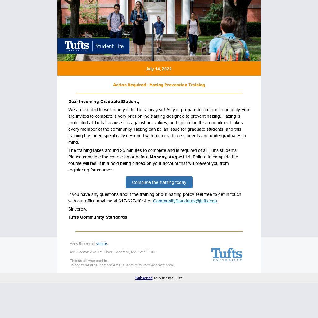 The training takes around 25 minutes to complete and is required of all Tufts students. Please complete the course on or before Monday, August 11. Failure to complete the course will result in a hold being placed on your account that will prevent you from registering for courses.