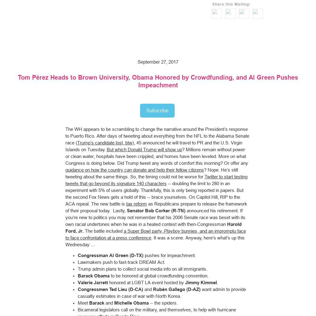 The WH appears to be scrambling to change the narrative around the President’s response to Puerto Rico. After days of tweeting about everything from the NFL to the Alabama Senate race (Trump’s candidate lost, btw), 45 announced he will travel to PR and the U.S. Virgin Islands on Tuesday. But which Donald Trump will show up? Millions remain without power or clean water, hospitals have been crippled, and homes have been leveled. More on what Congress is doing below. Did Trump tweet any words of comfort this morning? Or offer any guidance on how the country can donate and help their fellow citizens? Nope. He’s still tweeting about the same things. So, the timing could not be worse for Twitter to start testing tweets that go beyond its signature 140 characters -- doubling the limit to 280 in an experiment with 5% of users globally. Thankfully, this is only being reported in papers. But the second Fox News gets a hold of this -- brace yourselves. On Capitol Hill, RIP to the ACA repeal. The new battle is tax reform as Republicans prepare to release the framework of their proposal today. Lastly, Senator Bob Corker (R-TN) announced his retirement. If you’re new to politics you may not remember that his 2006 Senate race was beset with its own racial undertones when he was in a heated contest with then-Congressman Harold Ford, Jr. The battle included a Super Bowl party, Playboy bunnies, and an impromptu face to face confrontation at a press conference. It was a scene. Anyway, here’s what’s up this Wednesday ...- Congressman Al Green (D-TX) pushes for impeachment.