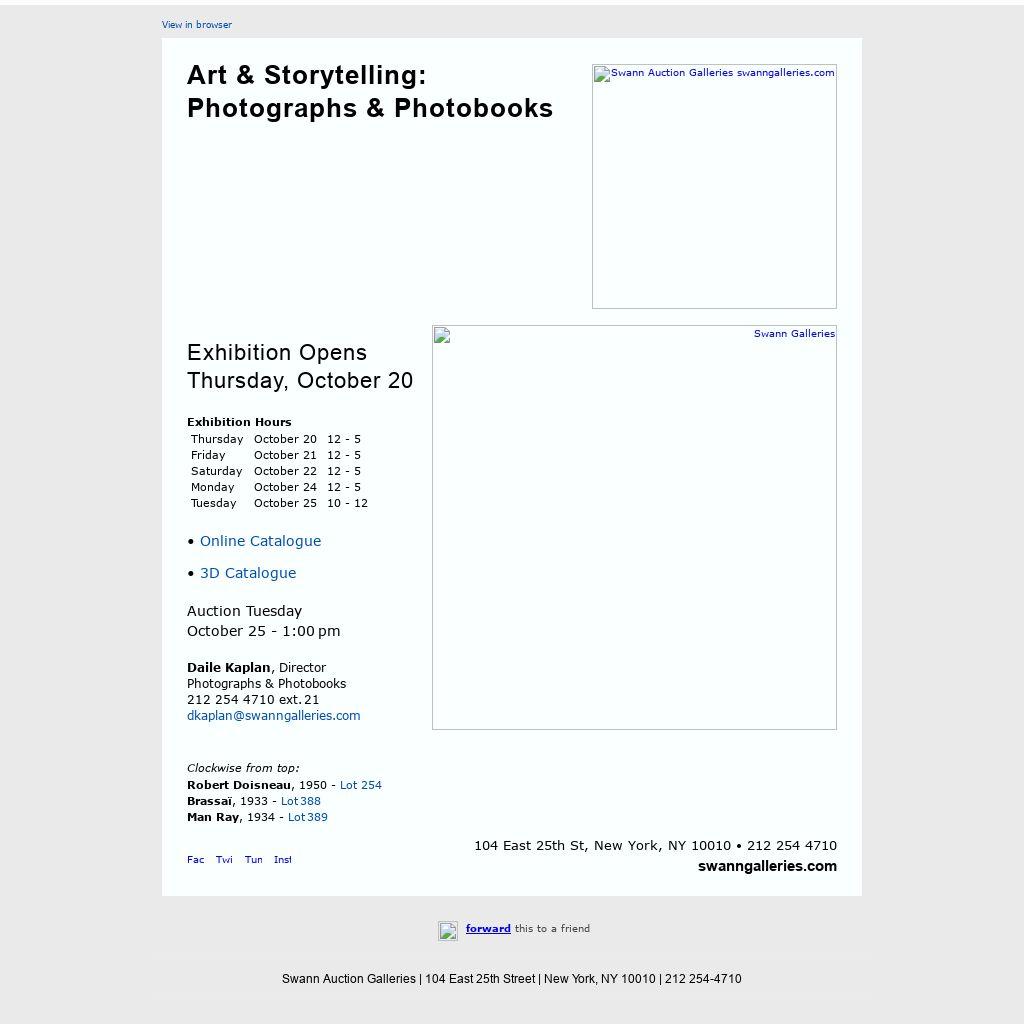 Thursday, October 20 Exhibition Hours | Thursday | October 20 | 12 - 5 | | Friday | October 21 | 12 - 5 | | Saturday | October 22 | 12 - 5 | | Monday | October 24 | 12 - 5 | | Tuesday | October 25 | 10 - 12 | Auction Tuesday
