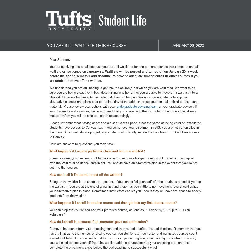 You are receiving this email because you are still waitlisted for one or more courses this semester and all waitlists will be purged on January 25. Waitlists will be purged and turned off on January 25, a week before the spring semester add deadline, to provide adequate time to enroll in other courses if you are unable to move off the waitlist.