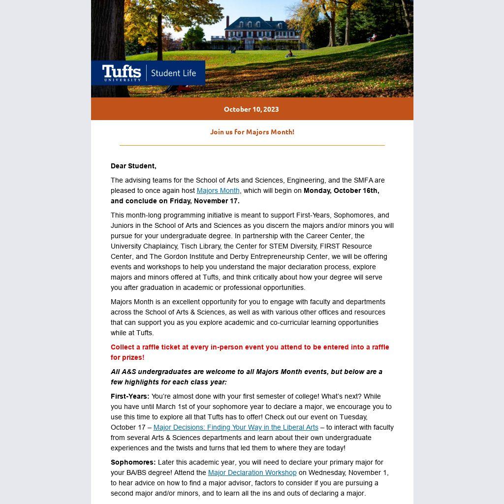 Majors Month is an excellent opportunity for you to engage with faculty and departments across the School of Arts & Sciences, as well as with various other offices and resources that can support you as you explore academic and co-curricular learning opportunities while at Tufts.