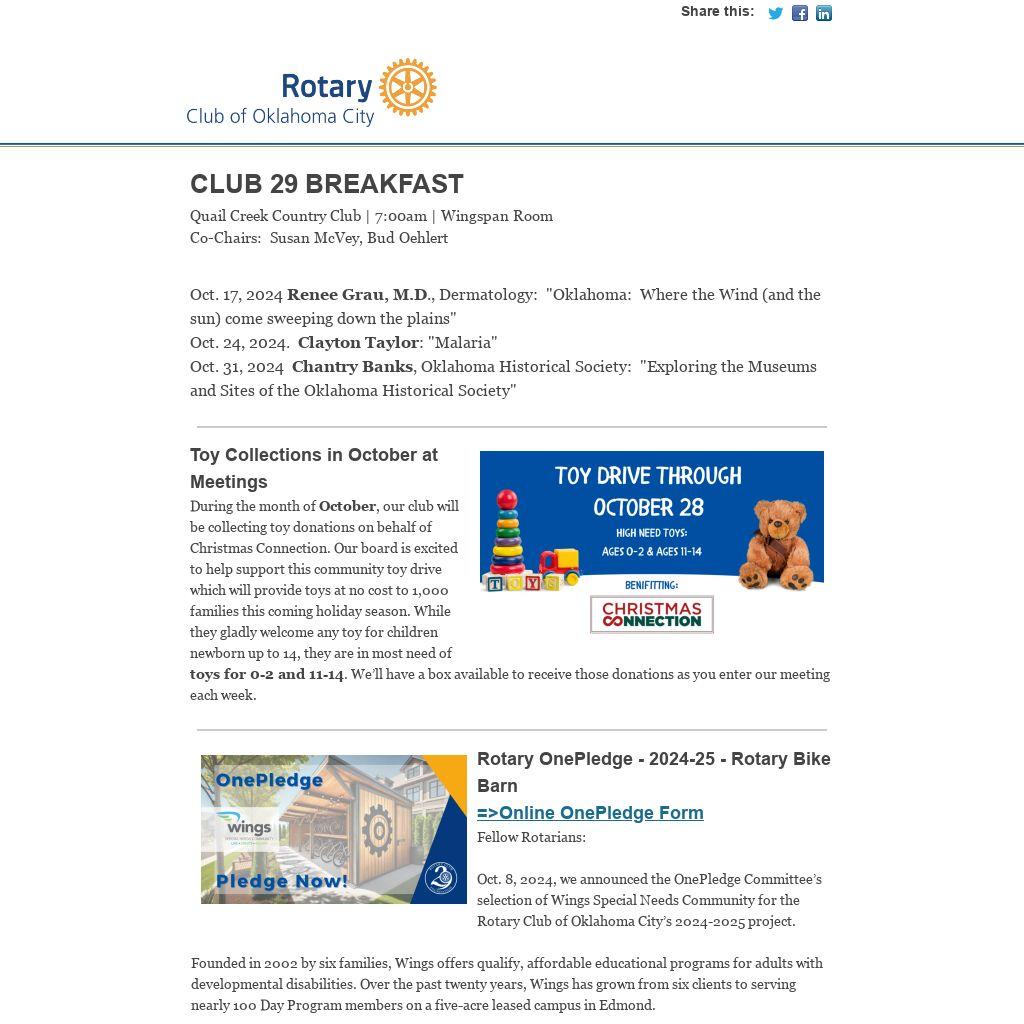 Oct. 8, 2024, we announced the OnePledge Committee’s selection of Wings Special Needs Community for the Rotary Club of Oklahoma City’s 2024-2025 project.