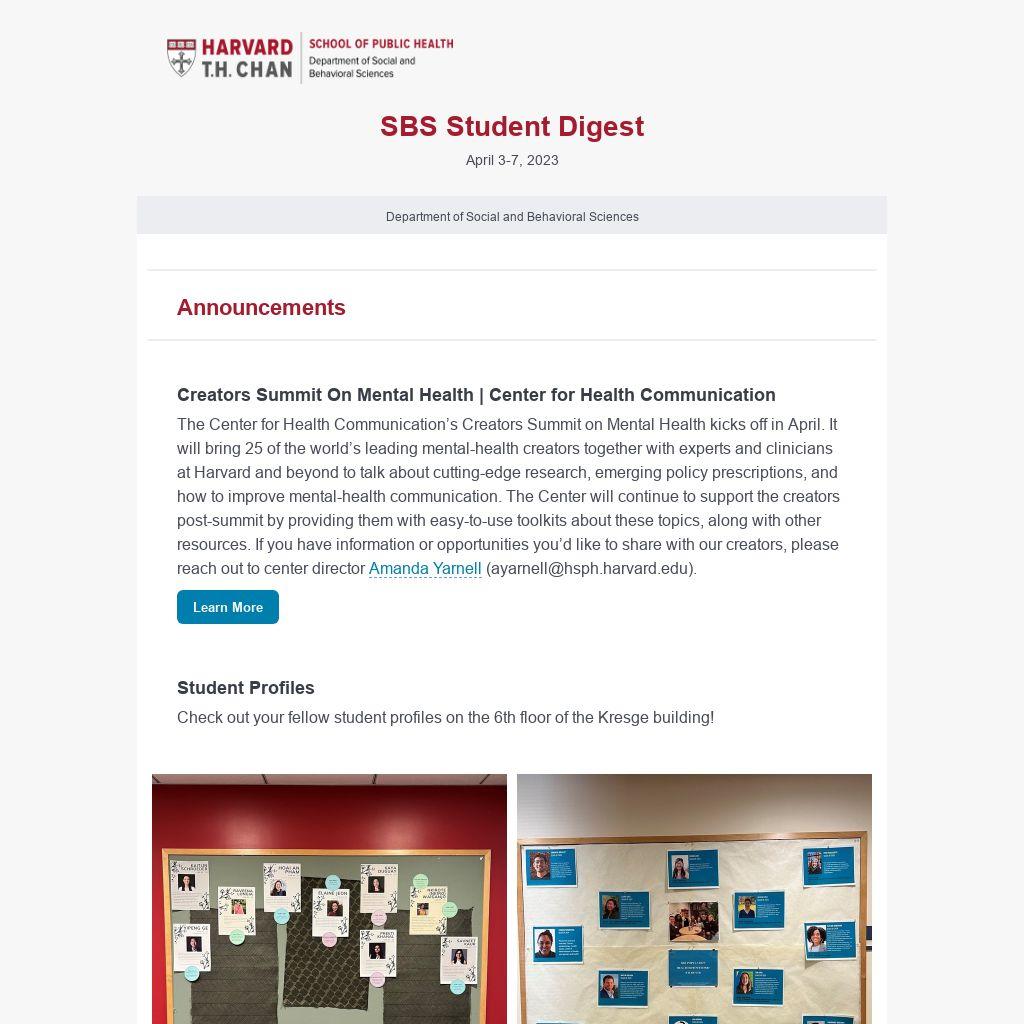 The Center for Health Communication’s Creators Summit on Mental Health kicks off in April. It will bring 25 of the world’s leading mental-health creators together with experts and clinicians at Harvard and beyond to talk about cutting-edge research, emerging policy prescriptions, and how to improve mental-health communication. The Center will continue to support the creators post-summit by providing them with easy-to-use toolkits about these topics, along with other resources. If you have information or opportunities you’d like to share with our creators, please reach out to center director Amanda Yarnell (ayarnell@hsph.harvard.edu).