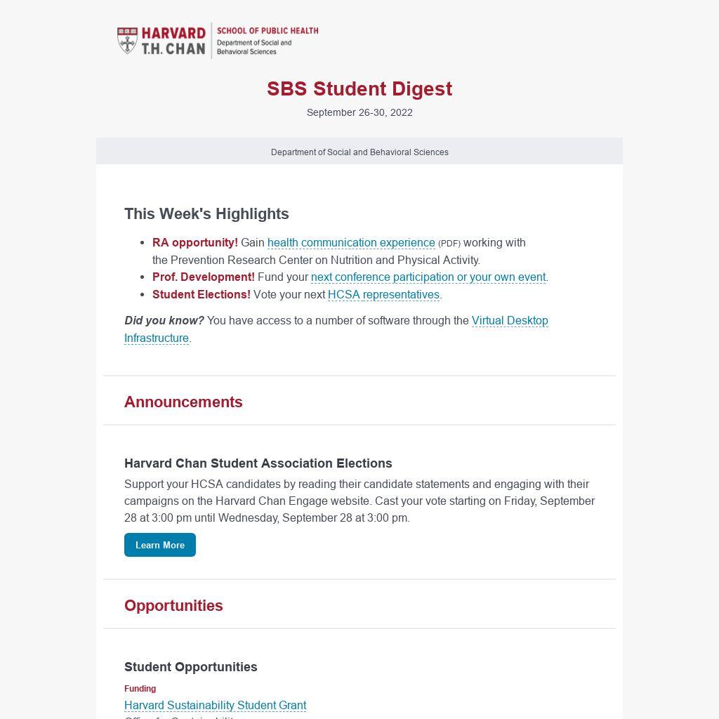 Support your HCSA candidates by reading their candidate statements and engaging with their campaigns on the Harvard Chan Engage website. Cast your vote starting on Friday, September 28 at 3:00 pm until Wednesday, September 28 at 3:00 pm.