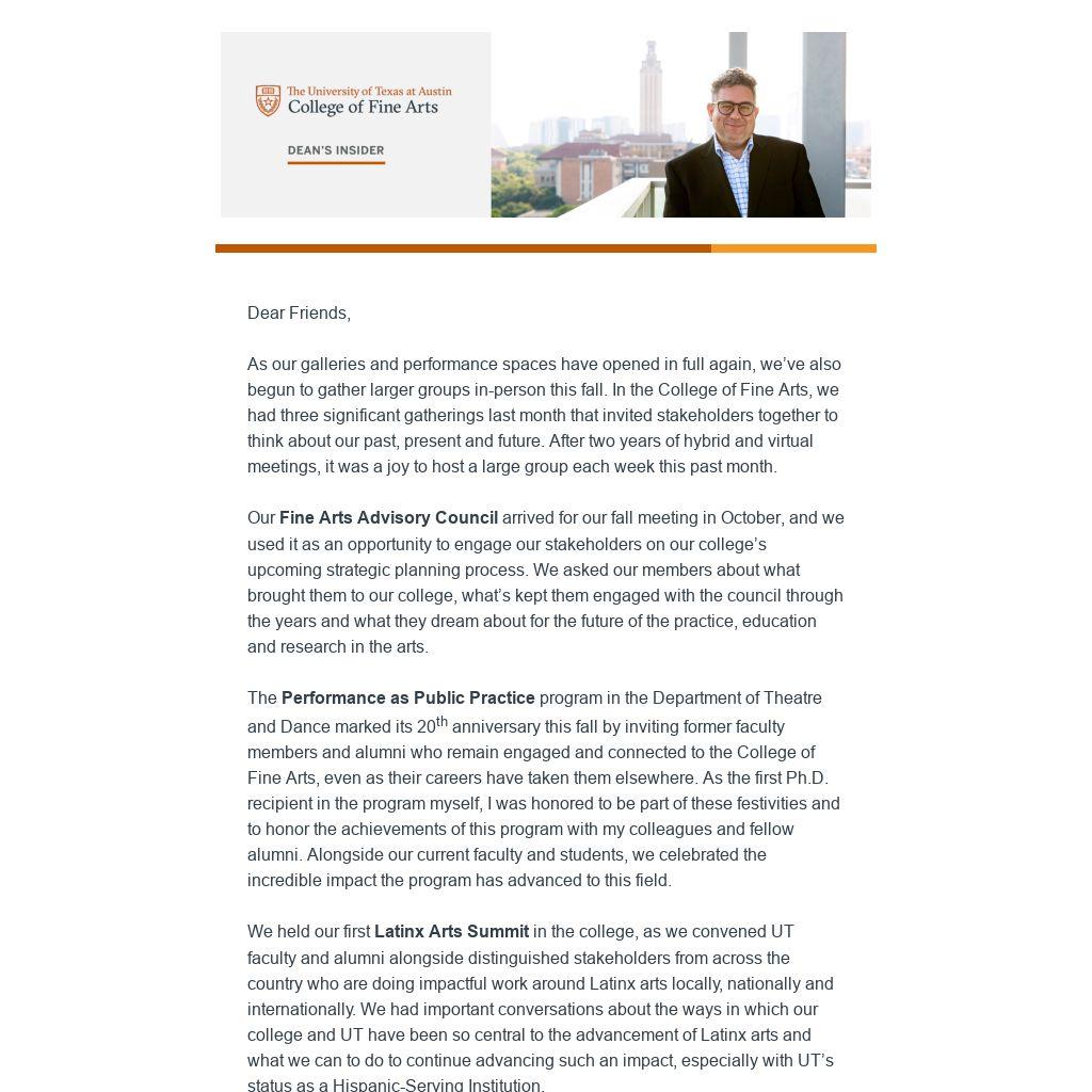 As our galleries and performance spaces have opened in full again, we’ve also begun to gather larger groups in-person this fall. In the College of Fine Arts, we had three significant gatherings last month that invited stakeholders together to think about our past, present and future. After two years of hybrid and virtual meetings, it was a joy to host a large group each week this past month.