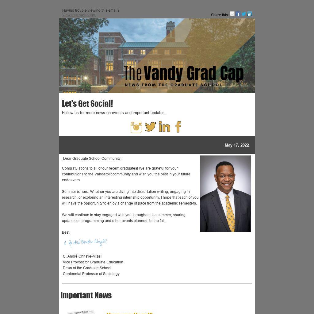 Newsletter SubmissionsTo submit content for this newsletter or to subscribe, please email all relevant information to gradschoolnews@vanderbilt.edu by the 11th day of each month. The newsletter will be published around the 17th day of each month.