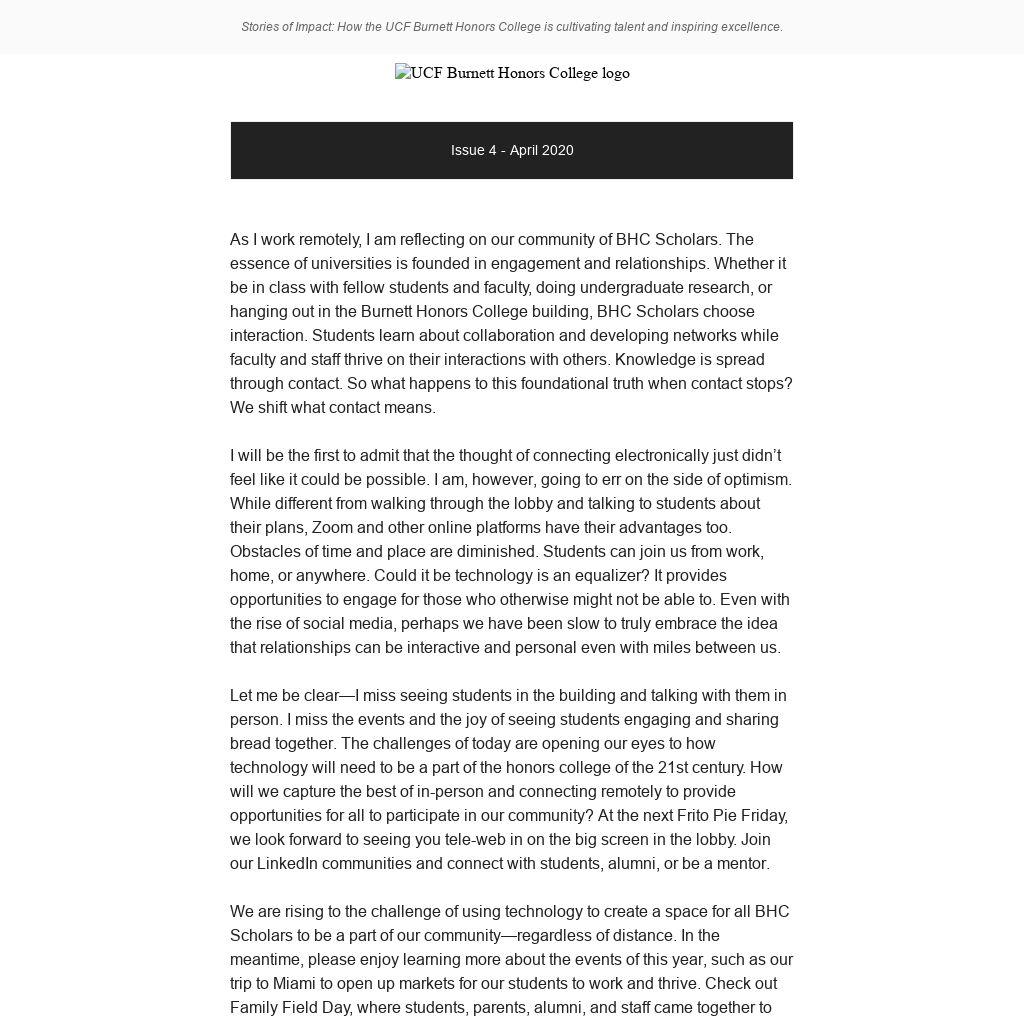 As I work remotely, I am reflecting on our community of BHC Scholars. The essence of universities is founded in engagement and relationships. Whether it be in class with fellow students and faculty, doing undergraduate research, or hanging out in the Burnett Honors College building, BHC Scholars choose interaction. Students learn about collaboration and developing networks while faculty and staff thrive on their interactions with others. Knowledge is spread through contact. So what happens to this foundational truth when contact stops? We shift what contact means.