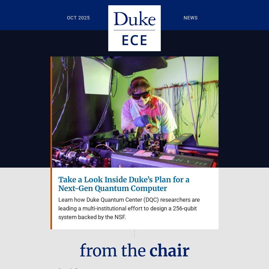 Quantum computing is one of today’s most transformative scientific frontiers, and Duke ECE is leading the charge in this field. Our faculty at the Duke Quantum Center conduct cutting‑edge research, advancing systems that are shaping the nation’s quantum infrastructure. In recent months, teams here earned major NSF support to design a 256‑qubit computer and to construct a 96‑qubit system—evidence of our depth across physics, devices and computing.