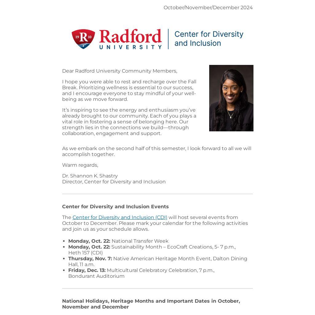 The Center for Diversity and Inclusion (CDI) will host several events from October to December. Please mark your calendar for the following activities and join us as your schedule allows.