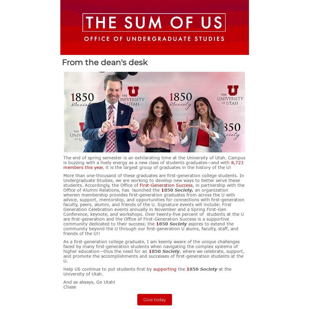 More than one-thousand of these graduates are first-generation college students. In Undergraduate Studies, we are working to develop new ways to better serve these students. Accordingly, the Office of First-Generation Success, in partnership with the Office of Alumni Relations, has launched the 1850 Society, an organization wherein membership provides first-generation graduates from across the U with advice, support, mentorship, and opportunities for connections with first-generation faculty, peers, alumni, and friends of the U. Signature events will include: First Generation Celebration events annually in November and a Spring First-Gen Conference, keynote, and workshops. Over twenty-five percent of students at the U are first-generation and the Office of First-Generation Success is a supportive community dedicated to their success; the 1850 Society aspires to extend the community beyond the U through our first-generation U alums, faculty, staff, and friends of the U!!