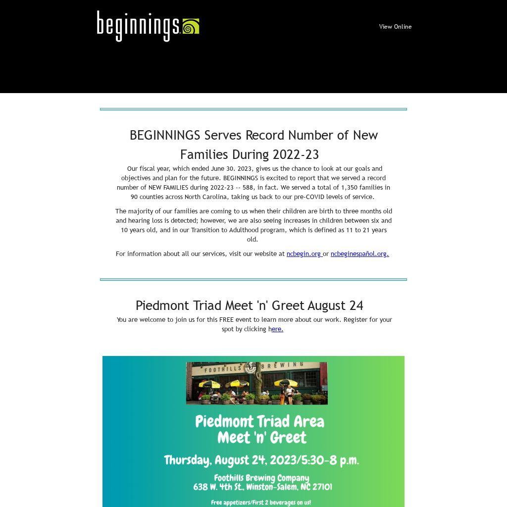 Our fiscal year, which ended June 30. 2023, gives us the chance to look at our goals and objectives and plan for the future. BEGINNINGS is excited to report that we served a record number of NEW FAMILIES during 2022-23 -- 588, in fact. We served a total of 1,350 families in 90 counties across North Carolina, taking us back to our pre-COVID levels of service.