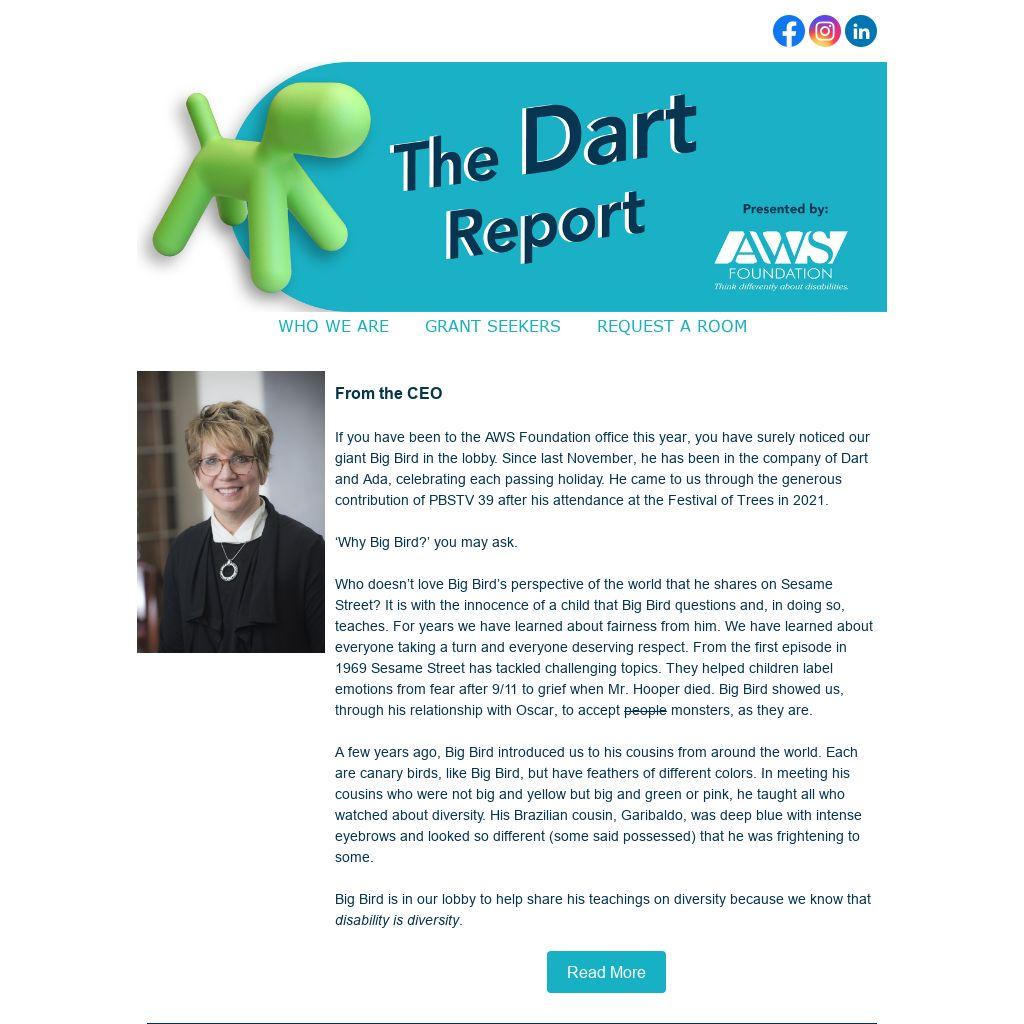 If you have been to the AWS Foundation office this year, you have surely noticed our giant Big Bird in the lobby. Since last November, he has been in the company of Dart and Ada, celebrating each passing holiday. He came to us through the generous contribution of PBSTV 39 after his attendance at the Festival of Trees in 2021.