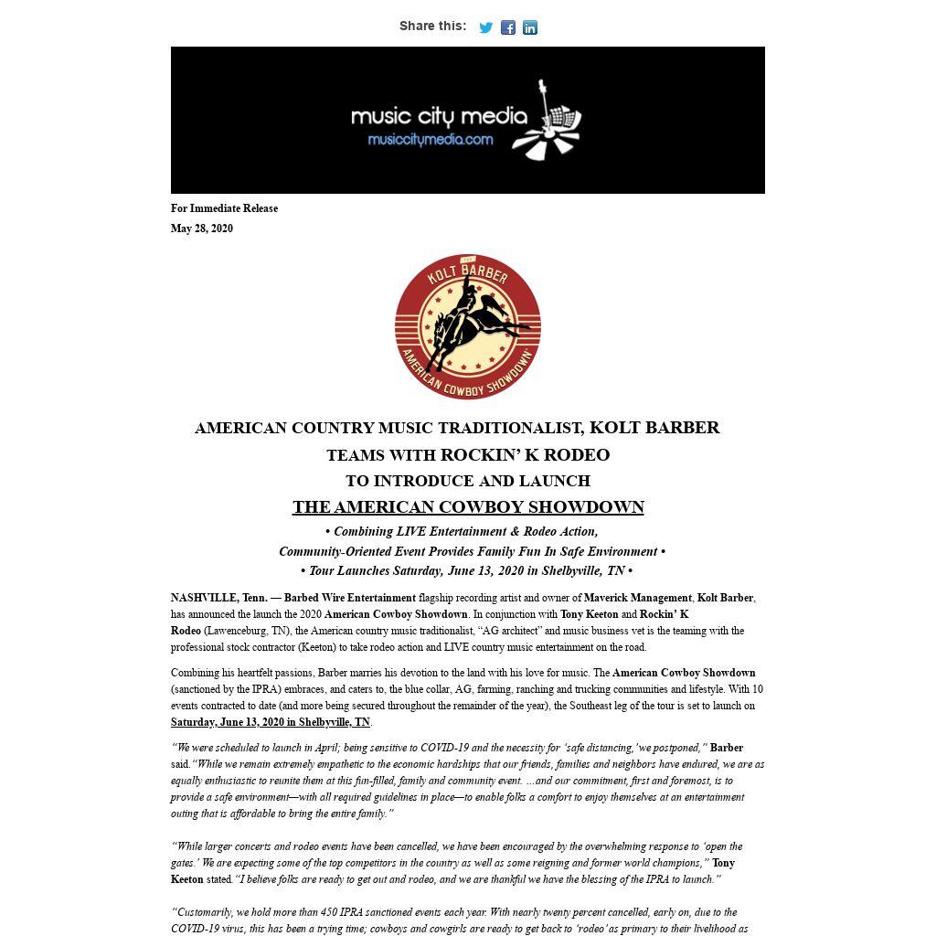 NASHVILLE, Tenn. — Barbed Wire Entertainment flagship recording artist and owner of Maverick Management, Kolt Barber, has announced the launch the 2020 American Cowboy Showdown. In conjunction with Tony Keeton and Rockin’ K Rodeo (Lawenceburg, TN), the American country music traditionalist, “AG architect” and music business vet is the teaming with the professional stock contractor (Keeton) to take rodeo action and LIVE country music entertainment on the road.