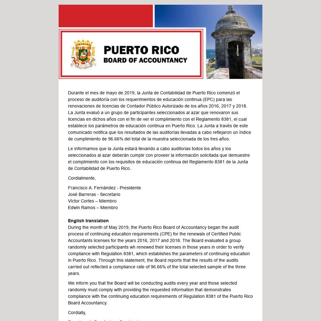 During the month of May 2019, the Puerto Rico Board of Accountancy began the audit process of continuing education requirements (CPE) for the renewals of Certified Public Accountants licenses for the years 2016, 2017 and 2018. The Board evaluated a group randomly selected participants wh renewed their licenses in those years in order to verify compliance with Regulation 8381, which establishes the parameters of continuing education in Puerto Rico. Through this statement, the Board reports that the results of the audits carried out reflected a compliance rate of 96.66% of the total selected sample of the three years.