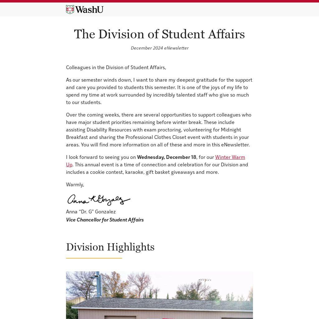 The Student Affairs eNewsletter is sent the first Tuesday of each month. If your department has content you would like featured, submit via the link below at least a week prior to the edition you would like to be included in.