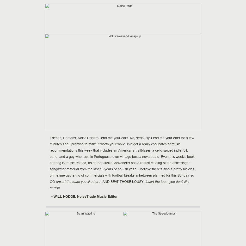 Friends, Romans, NoiseTraders, lend me your ears. No, seriously. Lend me your ears for a few minutes and I promise to make it worth your while. I’ve got a really cool batch of music recommendations this week that includes an Americana trailblazer, a cello-spiced indie-folk band, and a guy who raps in Portuguese over vintage bossa nova beats. Even this week’s book offering is music-related, as author Justin McRoberts has a robust catalog of fantastic singer-songwriter material from the last 15 years or so. Oh yeah, I believe there’s also a pretty big-deal, primetime gathering of commercials with football breaks in between planned for this Sunday, so GO (insert the team you like here) AND BEAT THOSE LOUSY (insert the team you don’t like here)!!