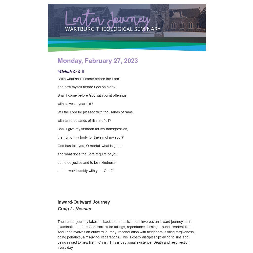 The Lenten journey takes us back to the prophets. Micah intensifies our attention to the inseparability of these two movements, inward and outward. Micah lays bare the hollowness of honoring God without honoring neighbors. Extravagant worship of God summons forth extravagant service to others: doing justice, loving kindness, walking humbly with God.