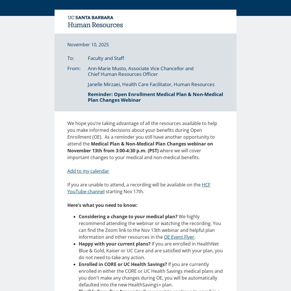 - Considering a change to your medical plan? We highly recommend attending the webinar or watching the recording. You can find the Zoom link to the Nov 13th webinar and helpful plan information and other resources in the OE Event Flyer.