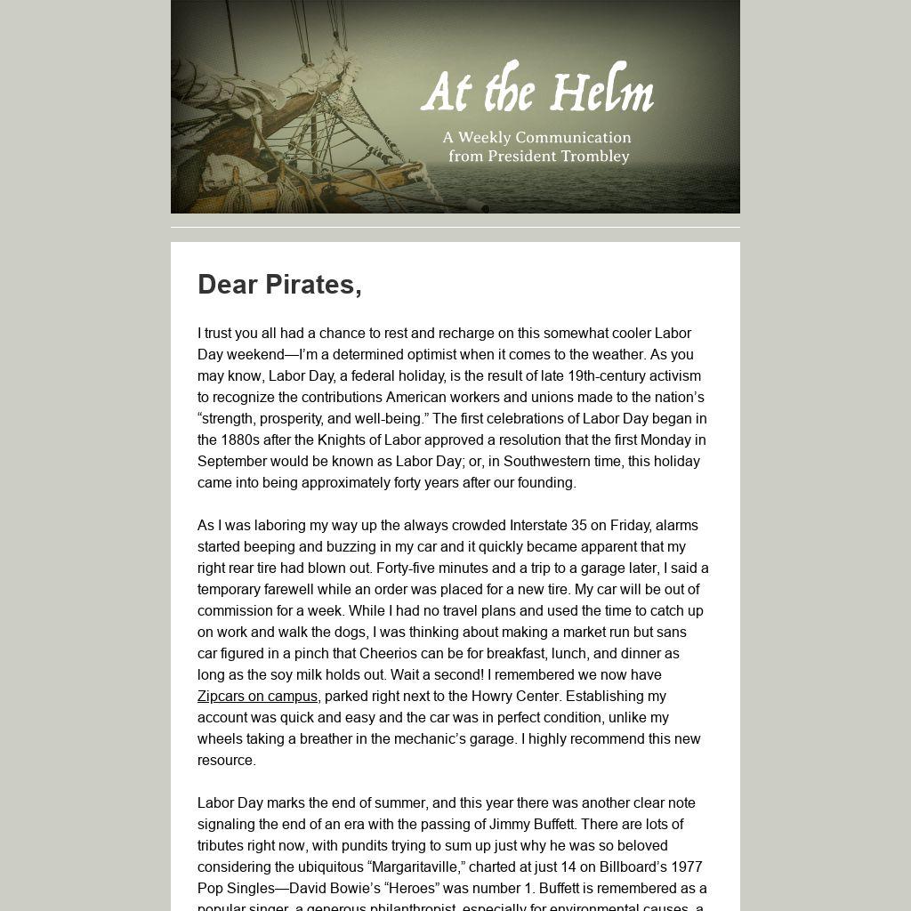 I trust you all had a chance to rest and recharge on this somewhat cooler Labor Day weekend—I’m a determined optimist when it comes to the weather. As you may know, Labor Day, a federal holiday, is the result of late 19th-century activism to recognize the contributions American workers and unions made to the nation’s “strength, prosperity, and well-being.” The first celebrations of Labor Day began in the 1880s after the Knights of Labor approved a resolution that the first Monday in September would be known as Labor Day; or, in Southwestern time, this holiday came into being approximately forty years after our founding.